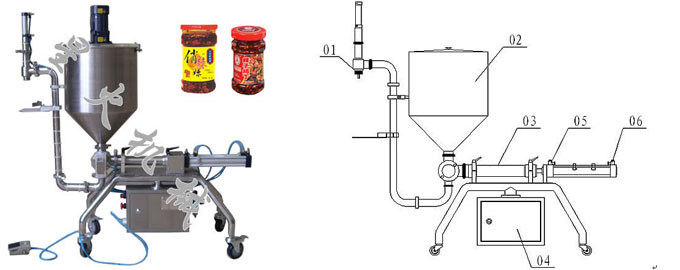 顆粒粘稠醬狀灌裝機是星火包裝機械有限公司主要針對粘稠并帶有顆粒類的醬狀物料灌裝而設計的,麻辣醬、香辣醬、牛肉醬、豆瓣醬、鮮辣醬、豆豉及郫縣豆醬等醬類灌裝。1、注料嘴,2、料桶,3、料缸,4、電控箱,5、出料節(jié)流閥,6、吸料節(jié)流閥。